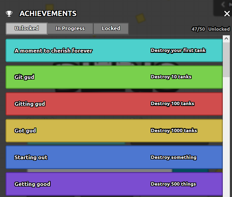 Achievements are rewards that may be earned for various feats. They were added to the game on February 21st. There are currently 50 achievements in total.