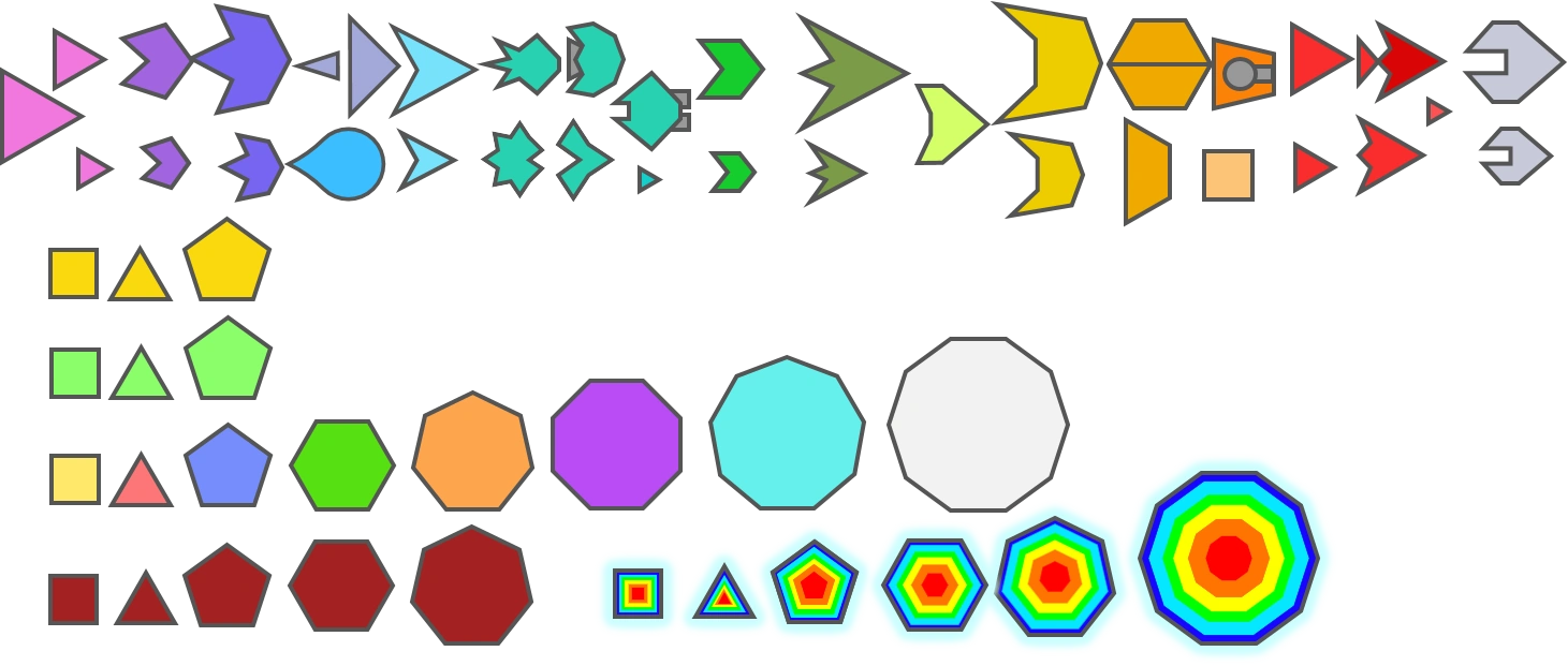 A large collection of polygons, crashers and many variants. (Made by Graviatar). From left-to-right: Crashers, Semi-Crushers, Crushers, Quasar and Split, Phasers, Phages, Phage Finale, Green Runners, Leechers, Vis Destructica, Disrupters, Splitter Hexagons and Trapezoid Guardians, Tankers and Summoner Squares, Red Runners, Triangle Finale, and White Destroyers. The rest of the polygons you already know :p