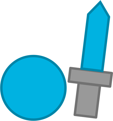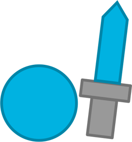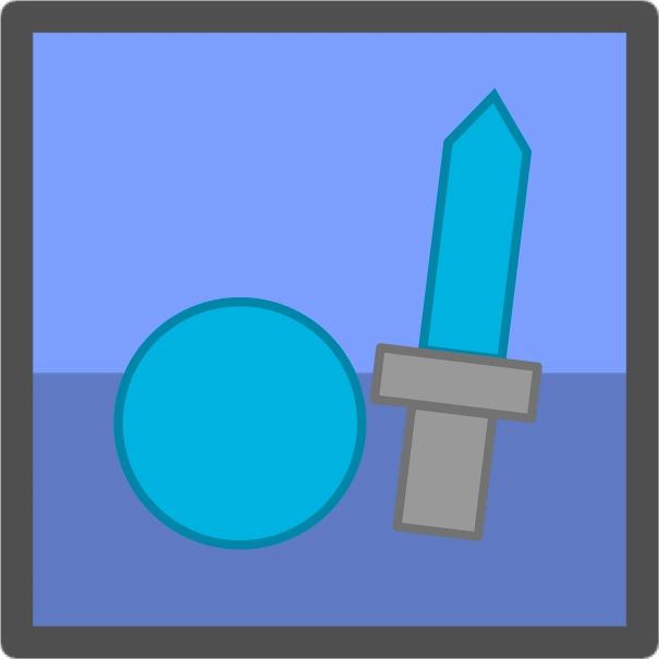The Swordsman has a circular body which holds (a few pixels away) a Sword. The Sword has a square grey handle with cross-guards of the same color. The Sword itself is semi-rectangular with a sharp triangular tip. It's the same color as the tank's body.