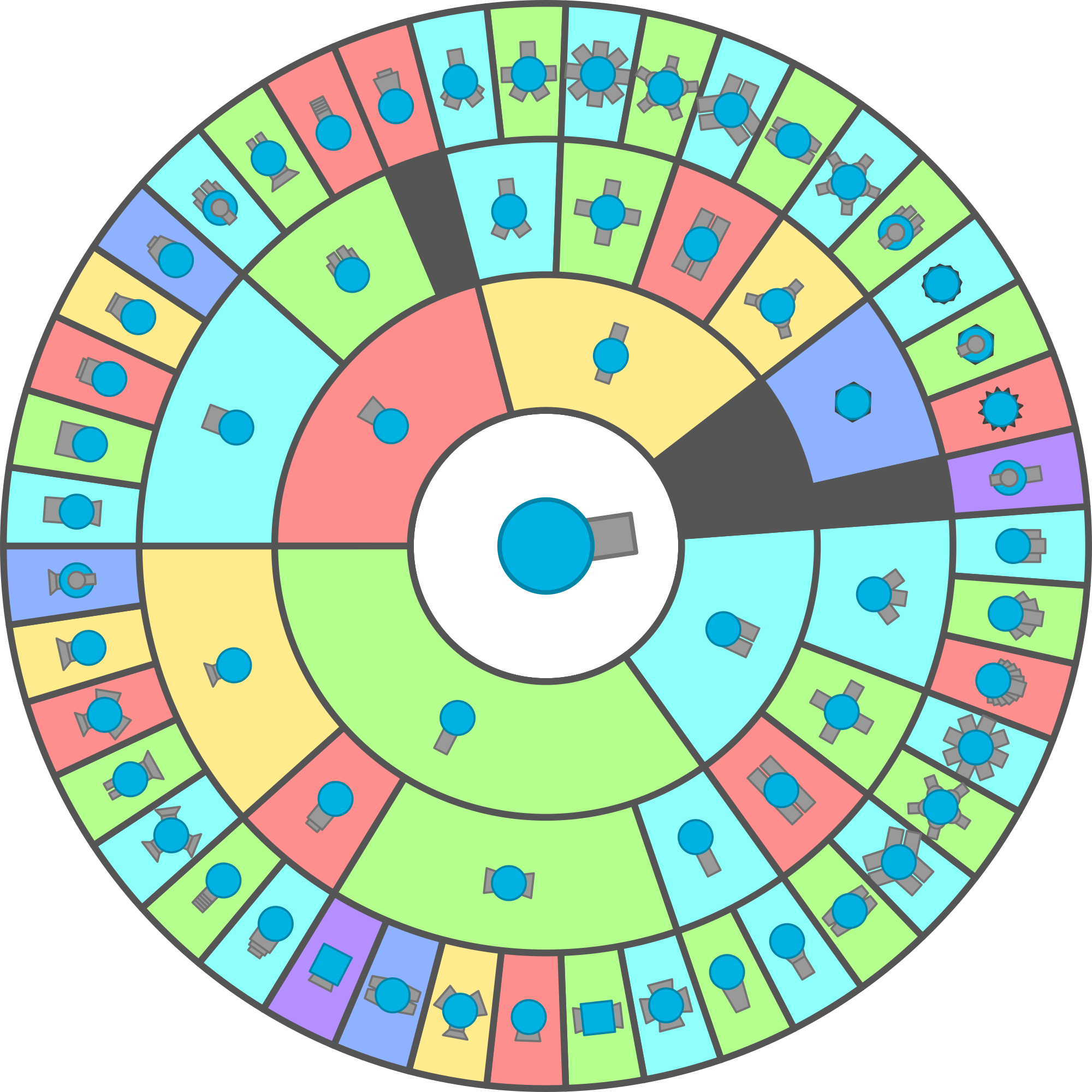 The Twin can upgrade into Triple Shot, Quad Tank, or the Twin Flank. If you choose Triple Shot, your tank’s dual cannons will move out onto the side pointing diagonally, making room for a third cannon in the middle. Triple Shot can then upgrade into Penta Shot, which adds an additional two not so spread cannons between the sides and the middle of your tank; Spread Shot, which adds an additional eight extremely spread cannons to the tank; or Triplet, which is basically a Twin with a third cannon in the middle. It shoots much faster than the Basic Tank but has less Bullet Damage and Penetration. If you choose Quad Tank, the two cannons move to the top and bottom and add another 2 cannons to the side spread out evenly. This will increase Reload and Bullet Speed. Quad Tank can then upgrade into Octo Tank, which has eight cannons (one facing in each normally used direction), or into Auto 5, which has 5 Auto Turrets instead of regular cannons. If you choose Twin Flank, your tank will receive an additional two cannons on the back. Twin Flank can then upgrade into Triple Twin. Triple Twin will make your tank have three pairs of cannons with equal distance from one pair to the other. You can also upgrade to Battleship, which switches all your cannons for drone launchers. These launchers fire drones that attack for you, all drones die after a certain amount of time and half of the drones can be controlled.